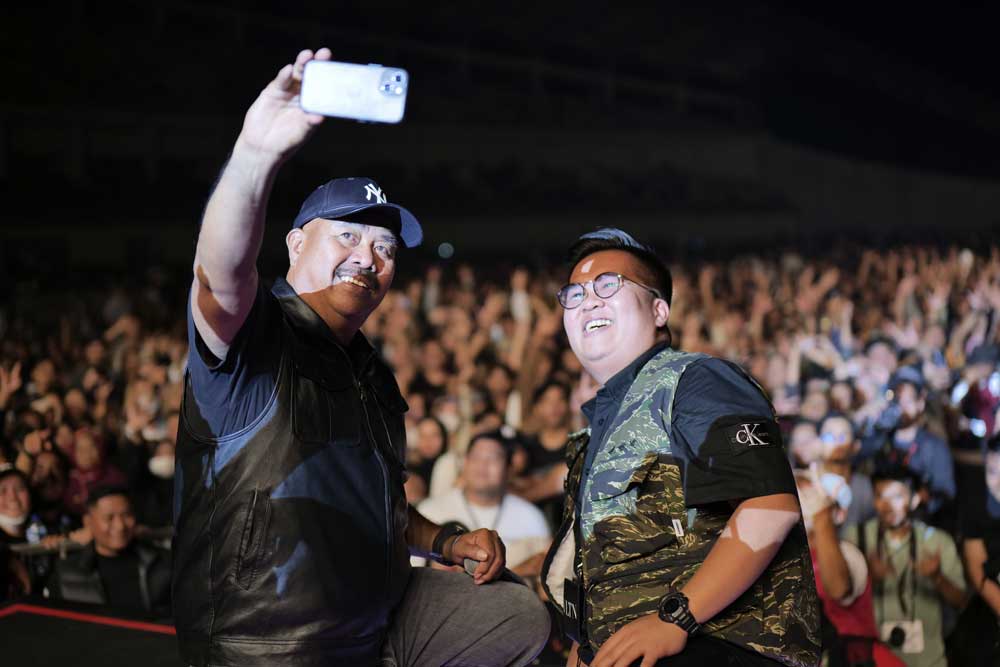 Bupati Kukar, Edi Damansyah, dan Wakil Bupati Kukar, Rendi Solihin, mengambil swafoto di panggung Kukarland Festival, 23 September 2023. (istimewa)